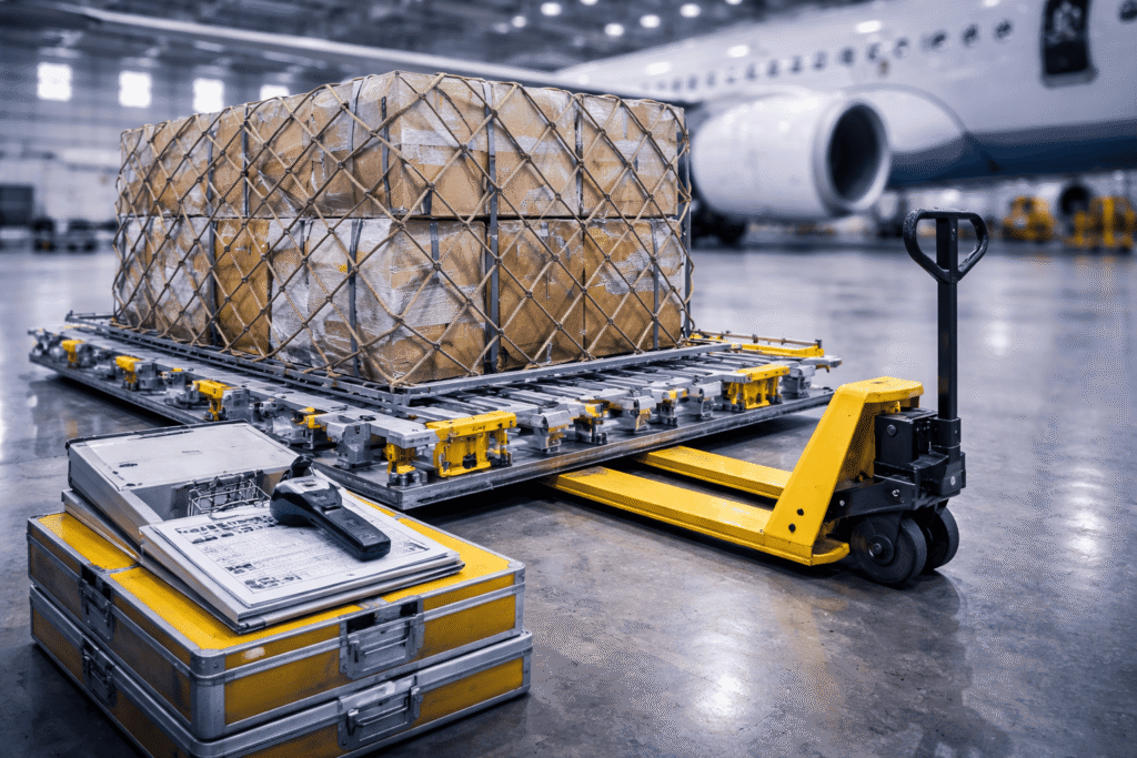 Equipment supporting aircraft cargo handling and freight operations.