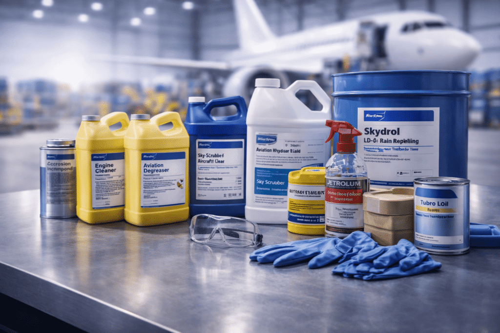 Aviation-approved chemicals sourced for maintenance and operational applications.